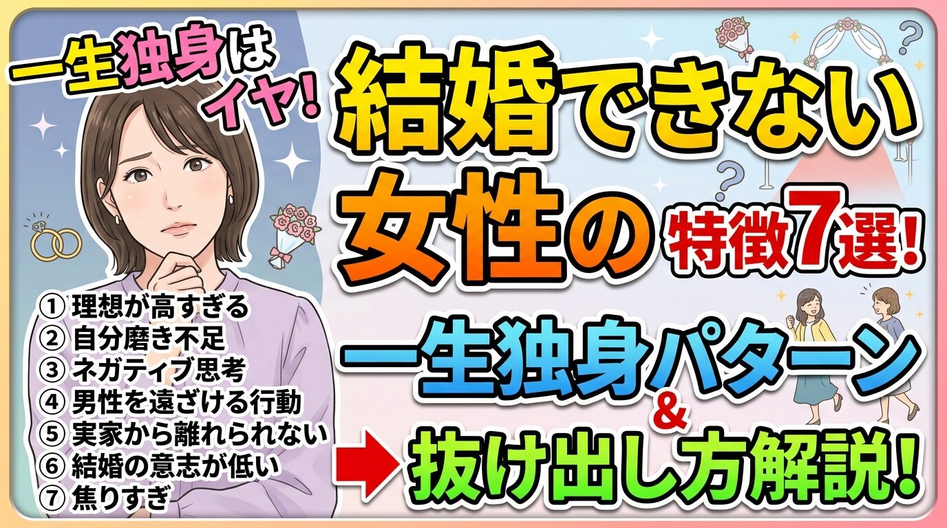 周りの友人が次々と結婚していく中で、「このままずっと一人なのかな」と不安になることはありませんか。焦る気持ちと「でも何をすればいいのか分からない」というモヤモヤした思いを抱えている方も多いはずです。実は結婚できない女性には共通する特徴があり、それに気づいて対策を取れば状況は変えられるのです。この記事では、結婚できない女性の特徴7つを具体的に解説しながら、今日からすぐに実践できる解決策をご紹介します。自分に当てはまる特徴を知ることで、理想のパートナーと出会うための第一歩を踏み出しましょう。